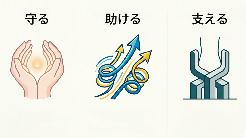 子どもにとっての靴の役割を整理すると、「守る」「助ける」「支える」という3つに分けられます。