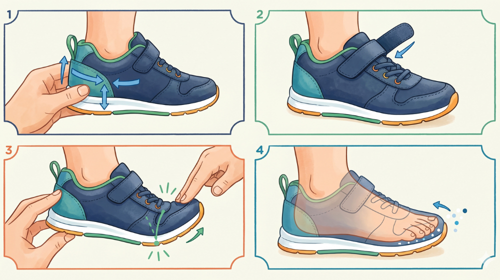 ①かかとがぐらつかずしっかり固定されているか。②マジックテープや靴ひもなどの留め具がついているか。③靴底が、足ゆびの付け根あたりの位置で曲がるか。④つま先に十分なゆとりがあるか。